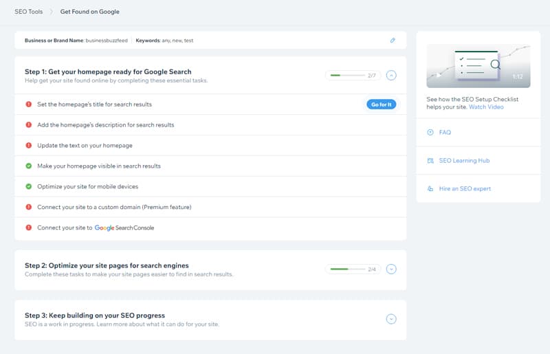 1. Wix’s SEO Wiz lets you easily create and edit your website’s title, meta tags, and other essential SEO settings.